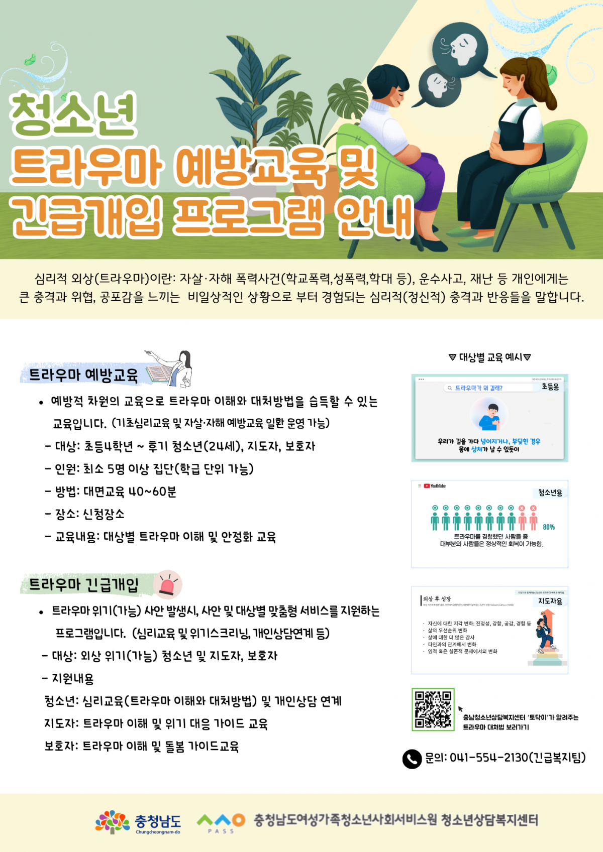 충청남도여성가족청소년사회서비스원 청소년상담복지센터에서는 도내 청소년의 트라우마 위기(가능) 대처능력 함양과 심리적외상으로 인한 2차피해를 최소화 하고자