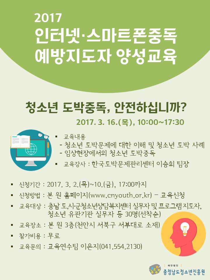 2017년 인터넷·스마트폰중독 예방지도자 양성교육 대상 2017-03-02 분야 23/30 교육기간 2017-03-16 ~ 2017-03-16 접수기간 2017-03-02 ~ 2017-03-11 장소 OFF 교육비 2017-03-11 정원 23/30 상태 마감 목록 상세내용 - 교육일시 : 2017.3.16.(목) - 신청기간 : 2017.3.2.(목) ~ 3.10.(금) 17:00까지 - 신청방법 : 본 원 홈페이지 접속 및 회원가입 → 교육신청 - 대 상 : 충남도,시군청소년상담복지센터 실무자 및 프로그램 지도자, 청소년유관기관 실무자 등 30명(선착순) - 장 소 : 본 원 3층 교육장 ※ 교육신청 선착순 확인 및 선정 후 교육대상자 개별 공지 예정 충남도,시군청소년상담복지센터 실무자 및 프로그램 지도자를 대상으로 우선 접수합니다. 문의. 교육연수팀 이은지(041.554.2130)