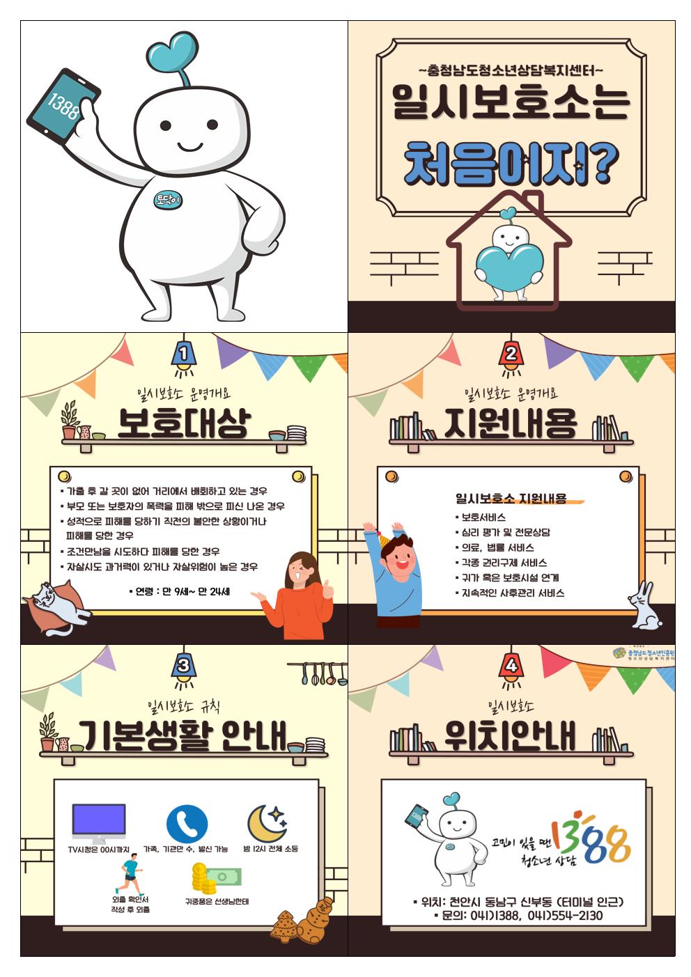 이에 (재)충청남도청소년진흥원(원장 박영의) 청소년상담복지센터는 위기상황에 노출된 청소년이 발생했을 경우 긴급구조하여 숙식제공 및 심리지원 등 필요한 서비스를 제공하는 일시보호소 ‘편안하루’를 365일, 24시간 운영하고 있다.