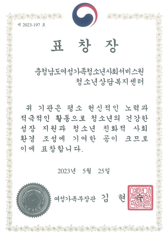 충청남도여성가족청소년사회서비스원(원장 조경훈) 청소년진흥본부 청소년상담복지센터가 2023년 여성가족부 청소년 육성 및 보호 유공 장관표창을 받았다.