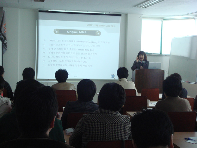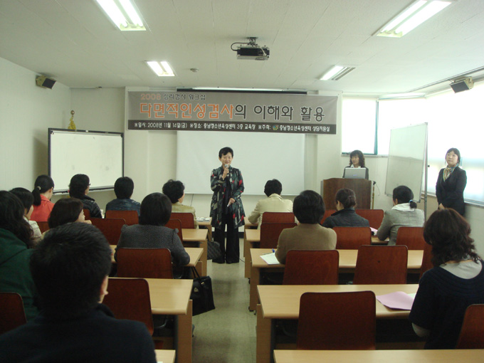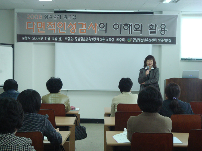 2008 심리검사워크샵 - 3842 | 최고관리자 | 2008-11-18 2008년 11월 14일(금) 09:20 ~ 18:00 단 하루였지만 총 8시간 동안 함께 했던 배움의 시간 긴 강의 동안 애써 주셨던 "마음사랑"의 문경주 선생님 딱딱한 의자에 앉아 집중하시느라 고생하셨던 심리검사 워크샵 참가자 선생님들 모두 모두 수고하셨습니다.
