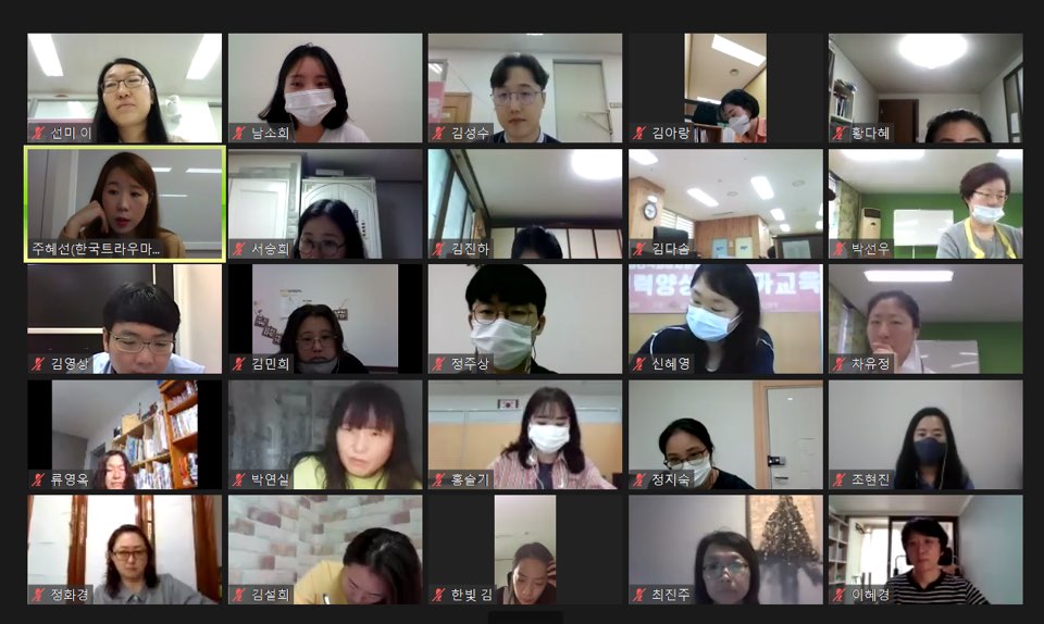 2020년 전문상담인력양성 전문가교육 1108 | 최고관리자 | 2020-11-17 2020년 PTSD전문상담인력양성 전문가교육 -일시: 2020년 9월 17일(목) 09:00~18:00 -방식: 온라인 플랫폼 활용한 비대면 교육 -대상: 청소년상담복지센터 및 유관기관 종사자, 학교상담사 등 PTSD 전문상담인력양성 심화교육 수료자 -내용: 기억노출 단계 근거기반 트라우마 심리치료