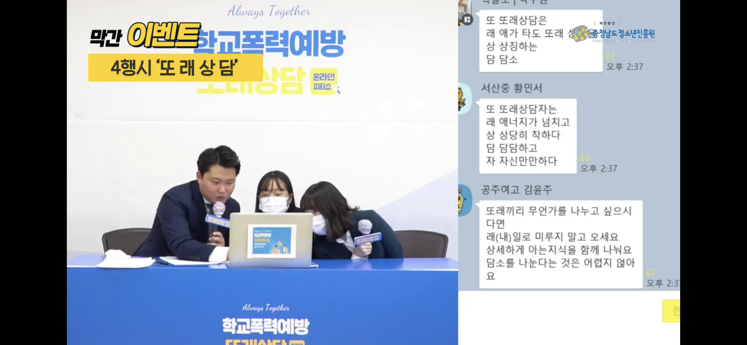 온라인 피티쇼는 지난 9월부터 진행된 또래상담 굿즈 디자인 공모전 시상식을 시작으로 10월 충청남도지사와 충청남도교육감 표창을 받은 5개 우수사례 피티발표와 질의응답 그리고 4행시 이벤트, OX퀴즈 등으로 꾸며져 청소년들의 많은 호응을 얻었습니다.