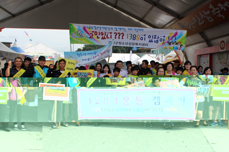 1234운동 캠페인 2차 금산지역 3286 | 최고관리자 | 2014-01-11 2013년 9월 7일 (토) 1234운동 금산지역 캠페인금산군청소년상담복지센터와 공동 운영금산군 1388청소년지원단장님을 비롯한 40여분의 1388청소년지원단 여러분께서 동참해주셨습니다.특히 지역민 뿐 아니라 외부인까지 많이 모이는 금산인삼축제 기간에 축제장에서 진행되어 큰 홍보효과를 거두었습니다,.