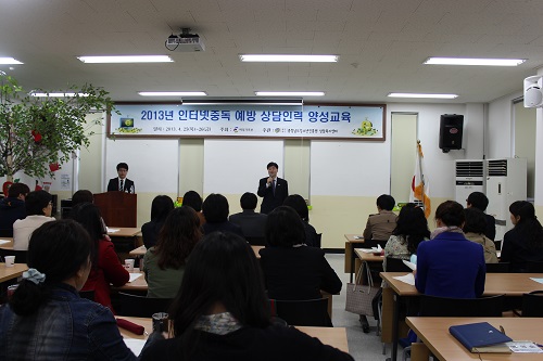 2013년 인터넷 중독예방 상담인력 양성교육 2966 | 최고관리자 | 2013-06-11 일시 : 2013년 4월 25일(목)~ 26일(금) 총 14시간 장소 : 본 원 교육장 (3층) 대상 : 청소년 유관기관 실무자, 청소년동반자, 교사 등 30명 수료. 프로그램 내용 : 1. 청소년 인터넷 및 스마트폰 중독의 실태 2. 청소년 인터넷 문화의 이해 3. 인터넷 중독 척도의 이해와 활용 4. 중독행동과 동기강화 상담