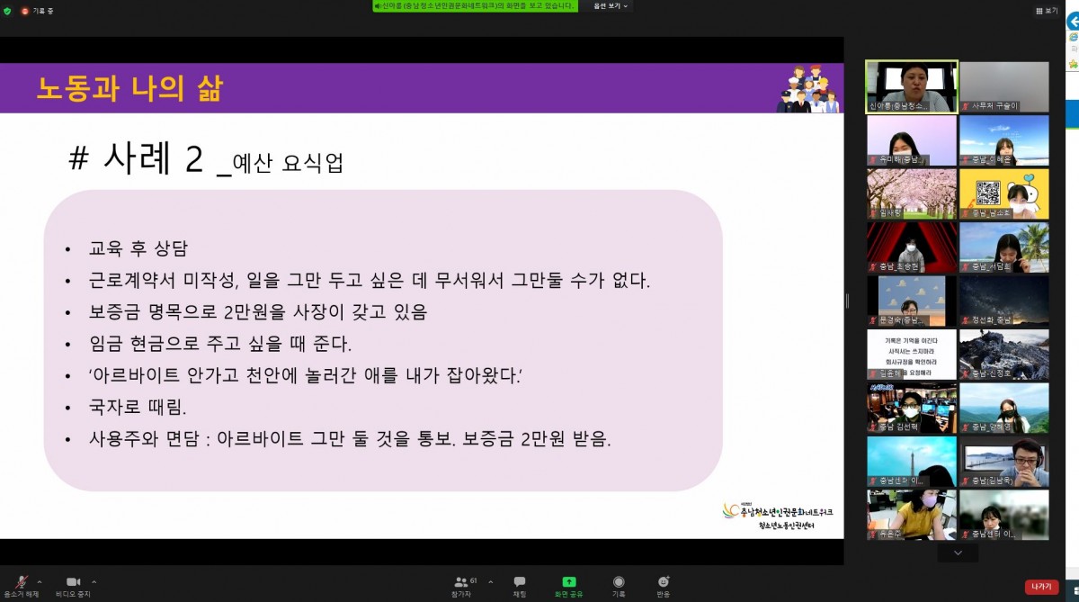 2021년 2차 인권교육 실시 1477 | 충남청소년진흥원 | 2021-12-16 1. 일 시: 2021.08.23(월) 13:00~17:002. 제 목: 1부: 직장내괴롭힘, 2부: 청소년노동인권3. 내 용: 청소년 유관기관으로써 청소년 노동인권에 대한 감수성을 깨우고, 갑질없는 상호 존중과 배려의 조직문화 조성을 위한 교육4. 강 사: 1부: 오진호(직장갑질119 집행위원장) 2부: 신아롱((사)충남청소년인권문화네트워크 교육국장)
