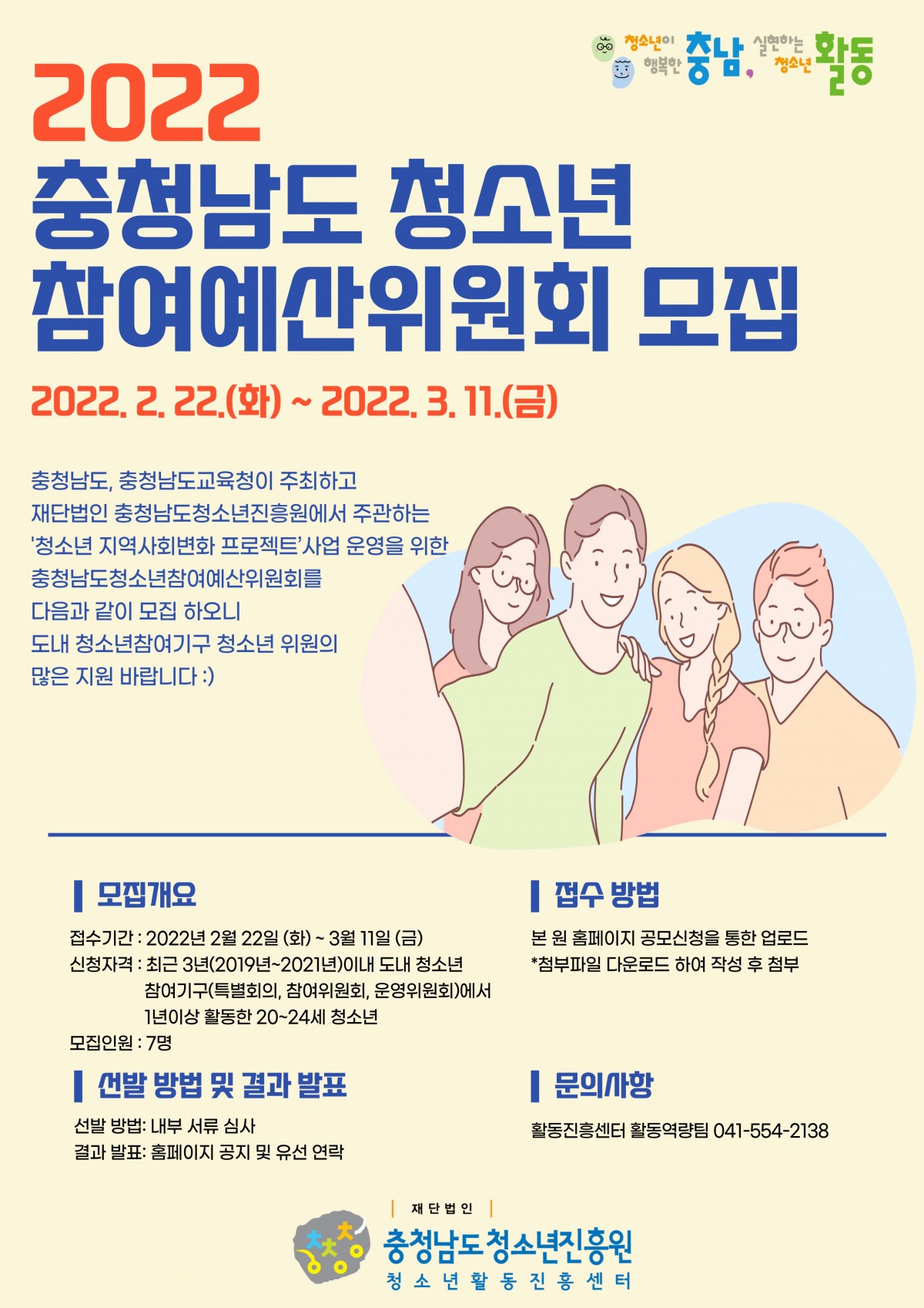 [공고]충청남도청소년참여예산위원회 모집 대상 2022. 2. 22.(화) 분야 300 교육기간 2022. 2. 22.(화) ~ 2022. 3. 11.(금) 접수기간 2022. 2. 22.(화) ~ 2022. 3. 11.(금) 장소 ON 교육비 2022. 3. 11.(금) 정원 300 상태 모집 2022.02.22 11:30 [붙임] 청소년참여예산위원회 모집 공고.pdf (173.2K) + 80 2022.02.22 11:30 [별첨1] 제출 서류 양식.hwp (19.0K) + 83 신청 목록 상세내용 충청남도, 충청남도교육청이 주최하고 재단법인 충청남도청소년진흥원에서 주관하는‘청소년 지역사회변화 프로젝트’사업 운영을 위한 충청남도청소년참여예산위원회를 다음과 같이 모집 하오니, 도내 청소년참여기구 청소년 위원의 많은 지원 바랍니다. 자세한 내용은 붙임 파일을 참고해 주세요.