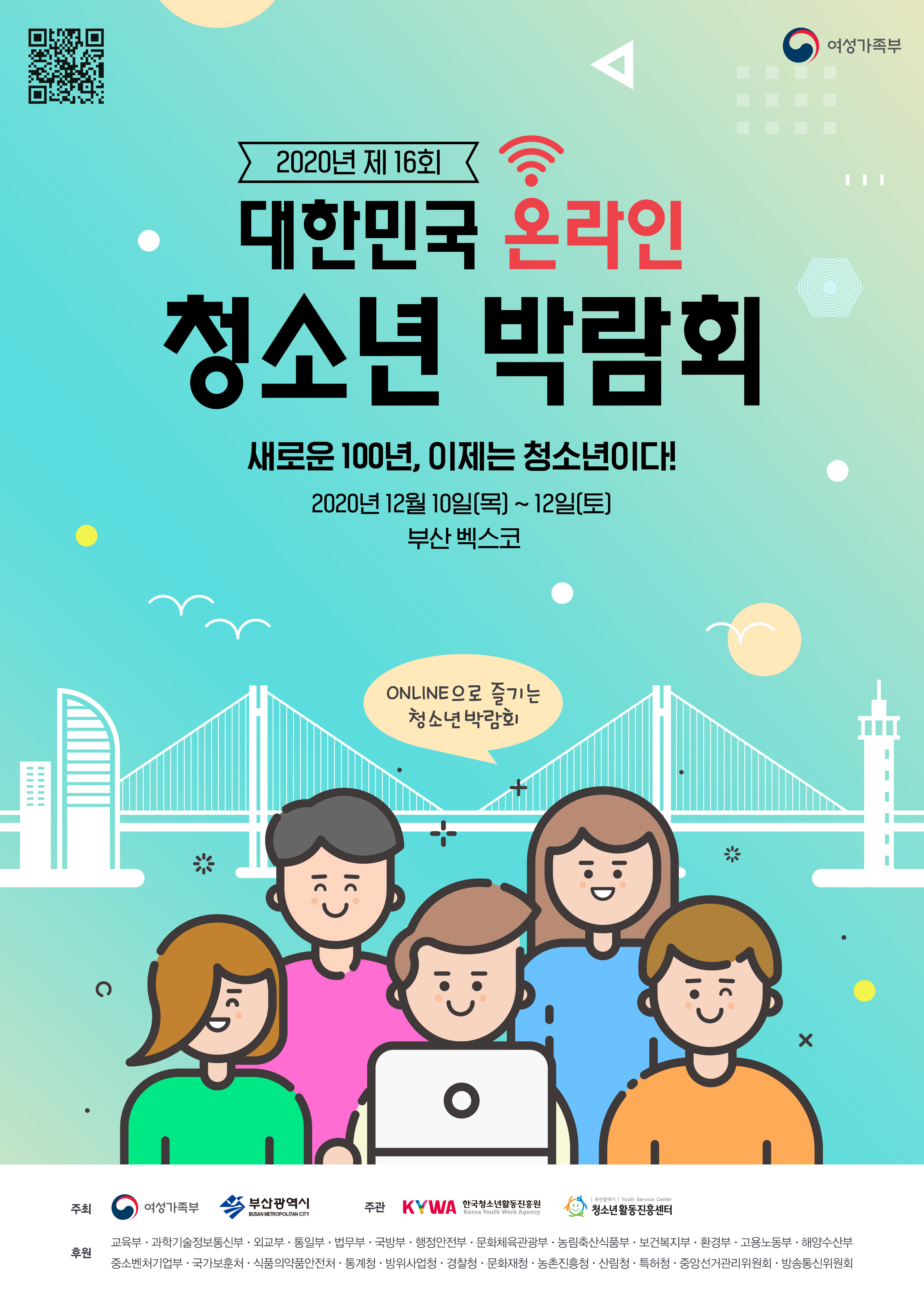 (홍보) 2020년 대한민국 청소년 박람회 안내 2187 | 최고관리자 | 2020-11-26 2020.11.26 10:24 2020년_대한민국_청소년_박람회.hwp (6.6M) + 10 제 16회 대한민국 청소년 박람회 기 간 : 2020. 12. 10.(목) ~ 12. 12.(토) 3일간 개최 주 최 : 여성가족부, 부산광역시 공동주최 주요 일정 : 박람회 홈페이지 및 유튜브 등을 통해 송출 (해당 시간 최초 송출 후 박람회 기간 동안 홈페이지 상시 게시) *일부 강의 및 체험 프로그램은 미리 신청한 청소년만 관람 가능합니다. 기타 자세한 내용은 첨부파일을 참고해주세요