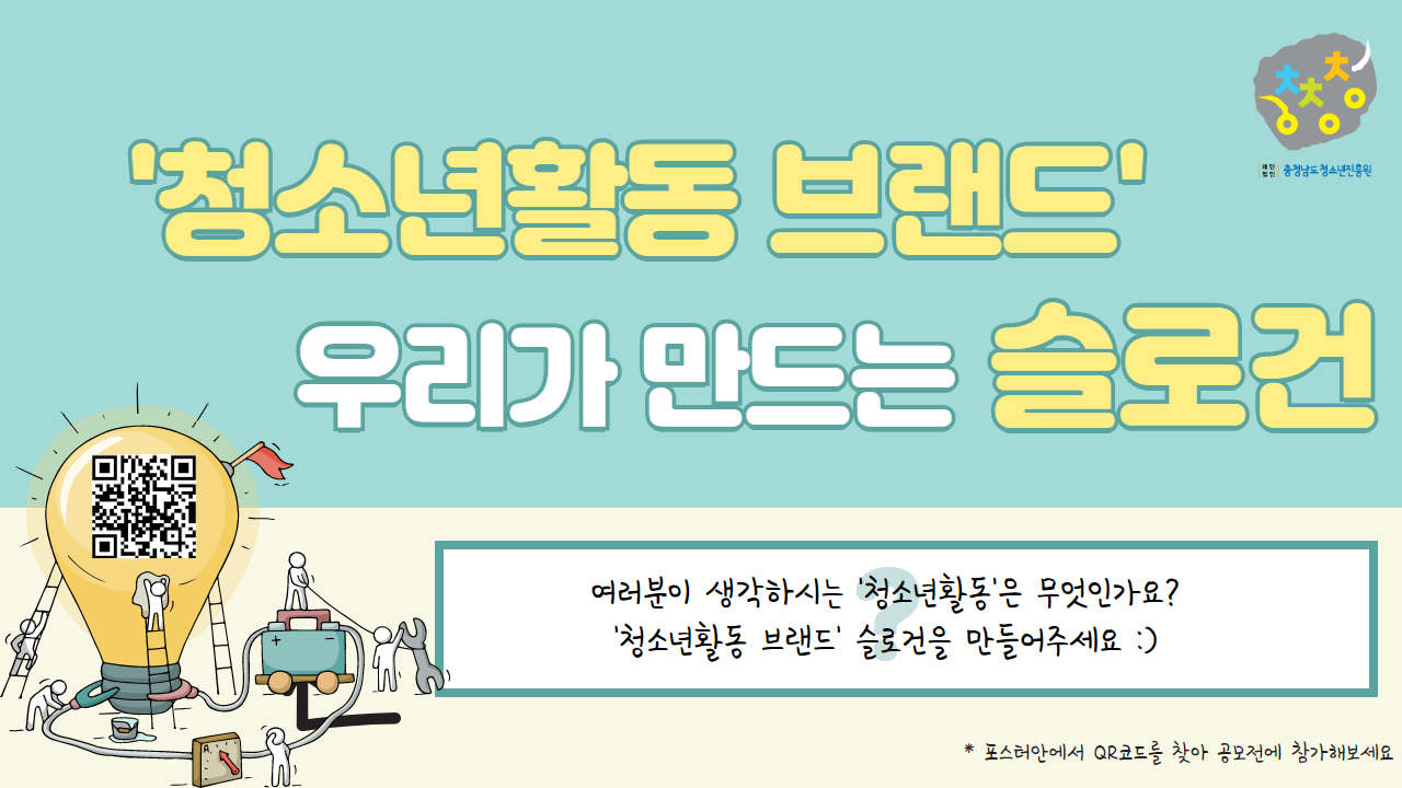 (홍보) '청소년활동 브랜드'슬로건 공모전 안내 2740 | 최고관리자 | 2020-08-24 2020.08.24 15:21 [별첨]법정대리인동의서.hwp (16.0K) + 7 2020.08.24 15:21 청소년활동_브랜드_슬로건_공모_안내.pdf (194.8K) + 0 충청남도 도민이라면 누구나 참여 가능한 '청소년활동 브랜드'슬로건 공모전이 열립니다!! 우리가 직접만들고 함께 사용해요 ♥ 청소년활동현장에서 사용하는 '청소년활동 브랜드' 슬로건이니 많은참여 부탁드립니다 :) 기타 자세한 사항은 첨부파일을 참고해주세요 ☎문의: 활동진흥센터 윤현지(041-562-9003)