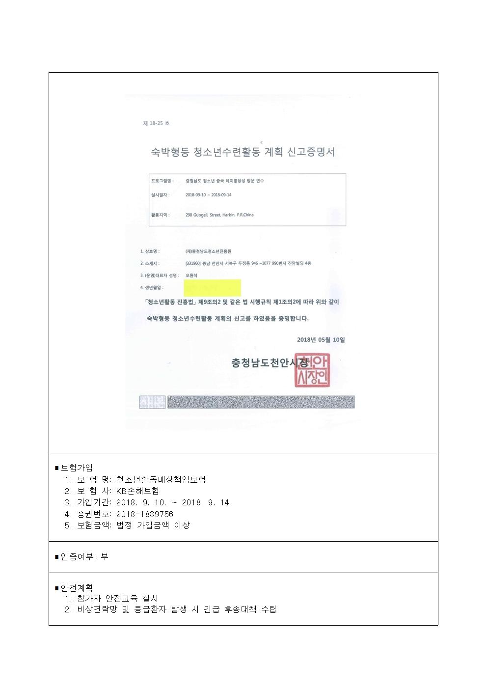 [신고수리고지] 충청남도 청소년 중국 헤이룽장성 방문 연수 2190 | 최고관리자 | 2018-05-23 청소년활동진흥법 제9조의2(숙박형등 청소년수련활동 계획의 신고)에 따라 붙임과 같이 고지합니다. * 프로그램명: 충청남도 청소년 중국 헤이룽장성 방문 연수 * 실시 일자: 2018. 9. 10.(월) ~ 14.(금) / 4박 5일 * 활동 지역 : 중국 헤이룽장성