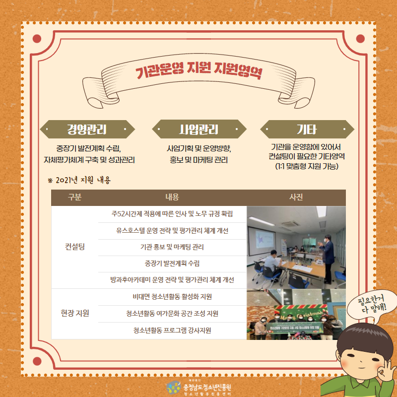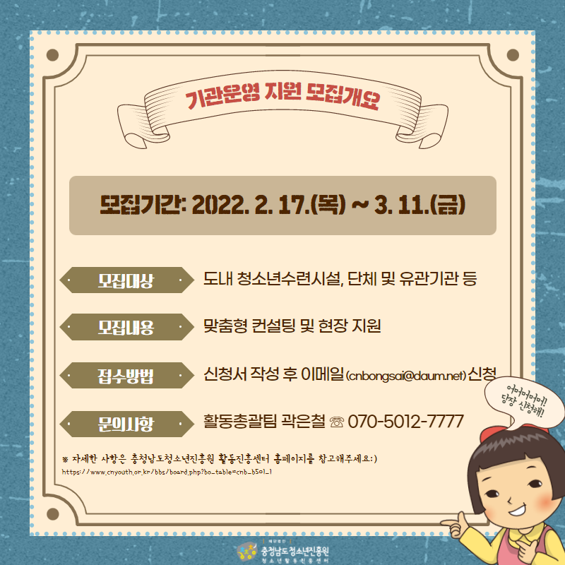 기관별 맞춤형 서비스를 지원해드리고자 청소년활동 기관운영 지원 사업 참여기관을 모집하오니