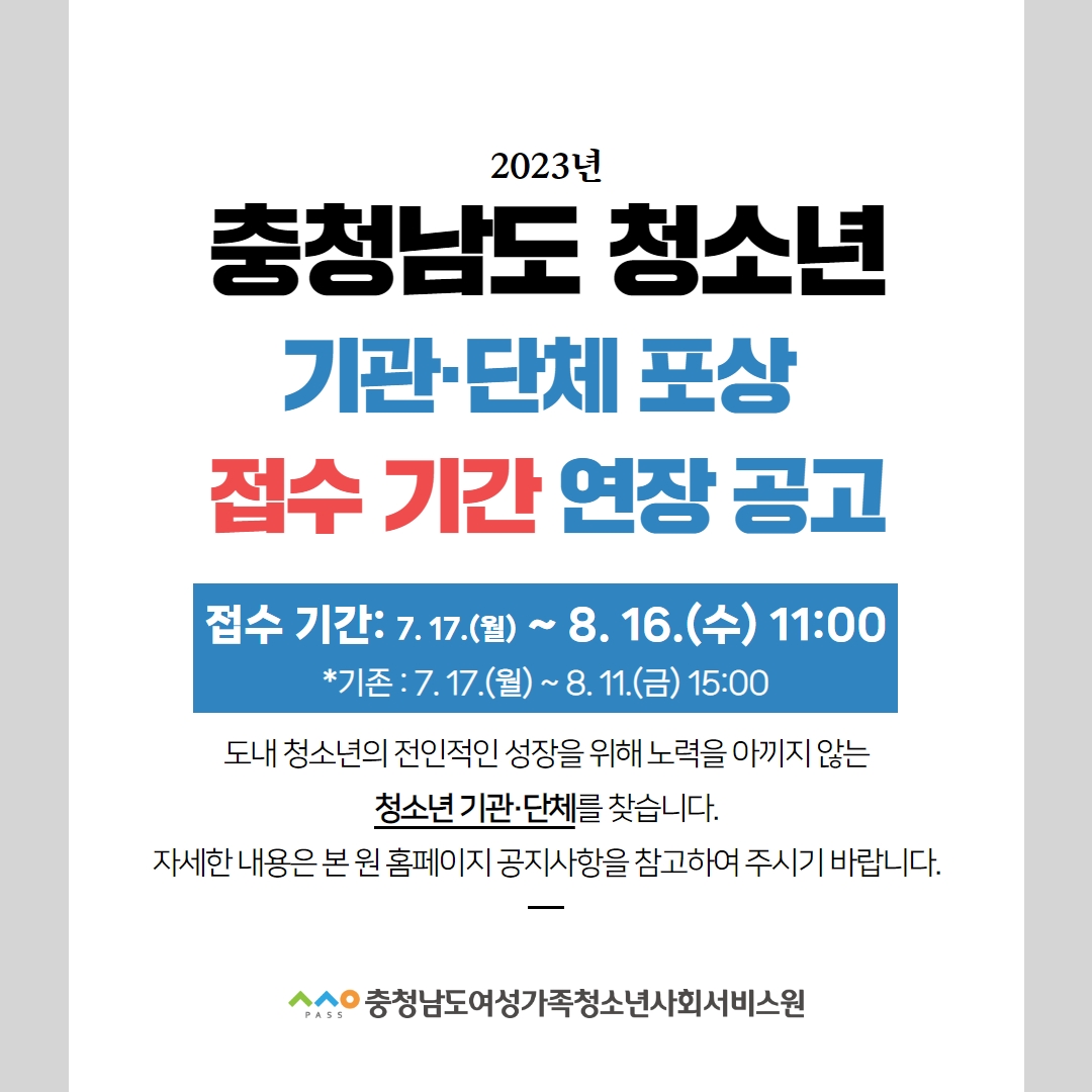 「2023년 충청남도 청소년활동 기관·단체 포상」접수 기간을 연장 하오니 실시하오니 많은 신청바랍니다.