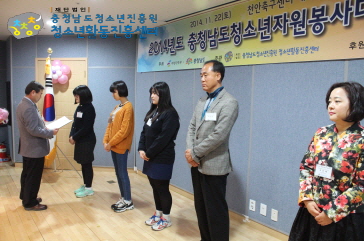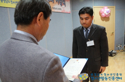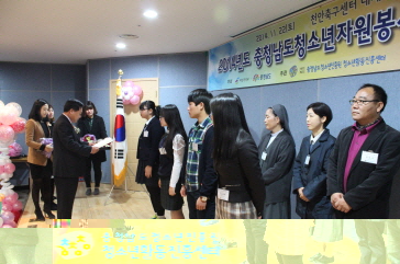 2014년도 충청남도청소년자원봉사대회 시상식 3855 | 최고관리자 | 2014-12-04 2014년도 충청남도청소년자원봉사대회 시상식 진행 일시 : 2014. 11. 22(토) 장소 : 천안축구센터 대세미나실 주요시상 - 여성가족부장관상 4점 - 충청남도지사상 및 표창 6점 - 충청남도교육감상 및 표창 10점 - (재)충청남도청소년진흥원이사장상 4점 - 우수활동터전 시상 1점 다시 한번 수상하신 모든 분들께 축하드립니다~^^