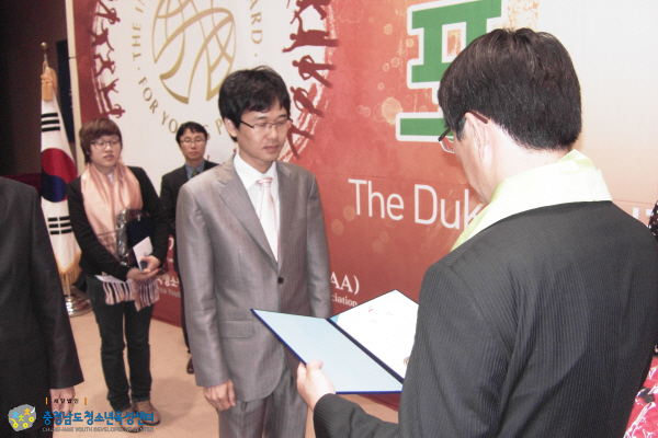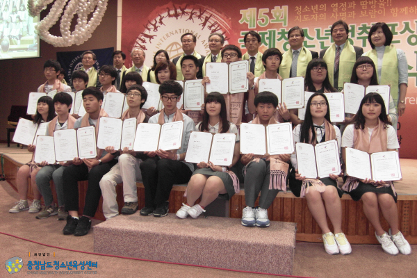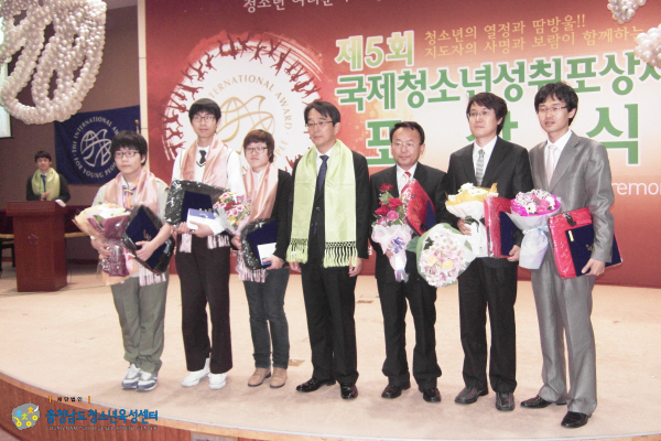 제5회 국제청소년성취포상식 4153 | 최고관리자 | 2011-06-21 제5회 국제청소년성취포상식서 충남도내 우수지도자(여성가족부장관상) 수상 및 청소년(동장) 6명 포상 등 ※사진 설명첫번째,두번째 사진 - 여성가족부 장관상을 수상하는 道 청소년육성센터 활동지원실 김영이 팀장세번째 사진 - 여성가족부장관상을 수상한 청소년육성센터 김영이 팀장(맨 우측)과 논산대건고 한우진 선생님(우측에서 두 번째)네번째 사진 - 제5회 국제청소년성취포상제 동장 포상을 받는 충청남도 청소년(두번째줄 우측 첫 번째 두 번째 첫 번째 줄 좌측 첫번째