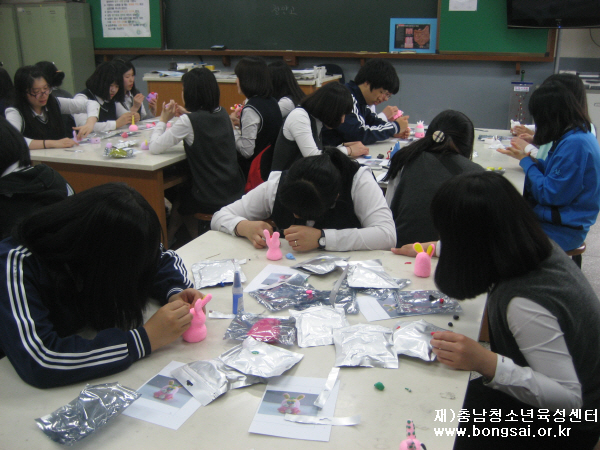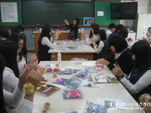 청양고 나누미 동아리 봉사활동 프로그램 지원 4381 | 최고관리자 | 2010-05-25 (재)충청남도청소년육성센터 활동지원실에서는 청소년봉사활동 동아리 지원사업을 실시하고 있습니다. 그 사업의 일환으로 선정된 동아리에 봉사활동 프로그램 지원을 진행중입니다. 5월 24일(월)에 청양고등학교 나누미 동아리가 소프트클레이를 배워보는 시간을 가졌습니다.