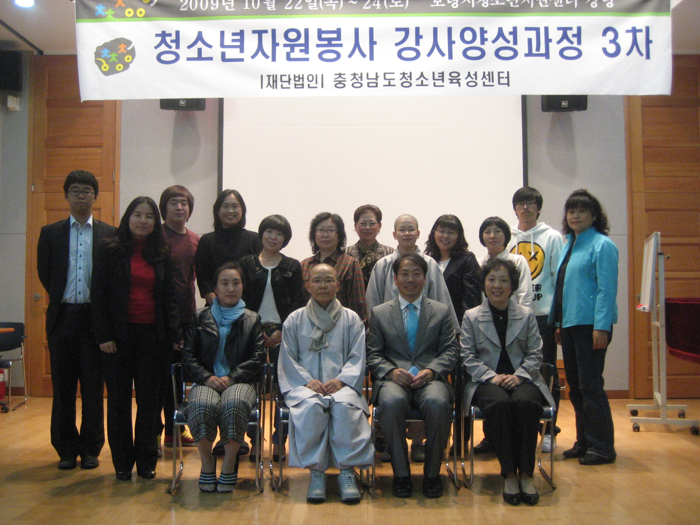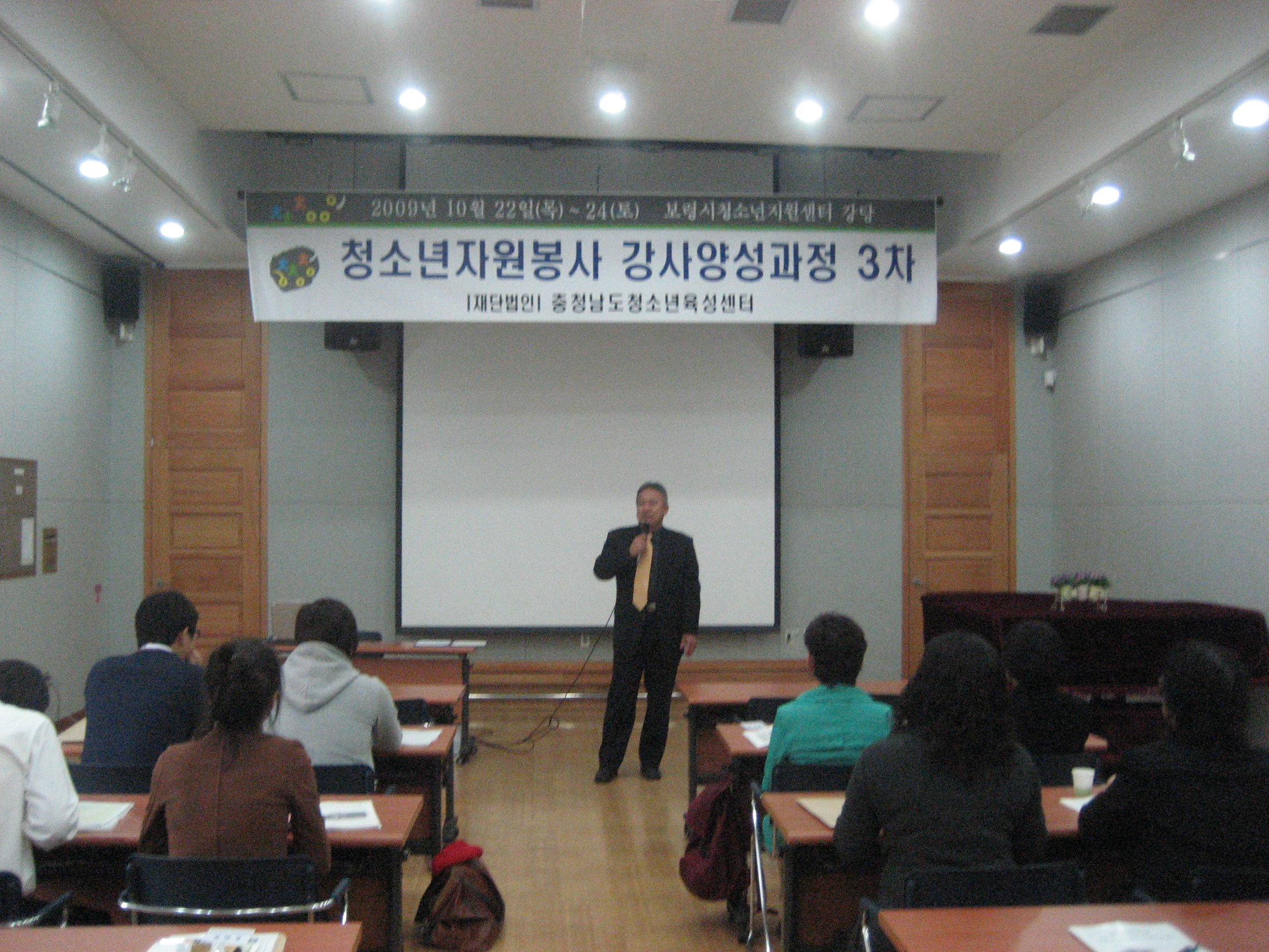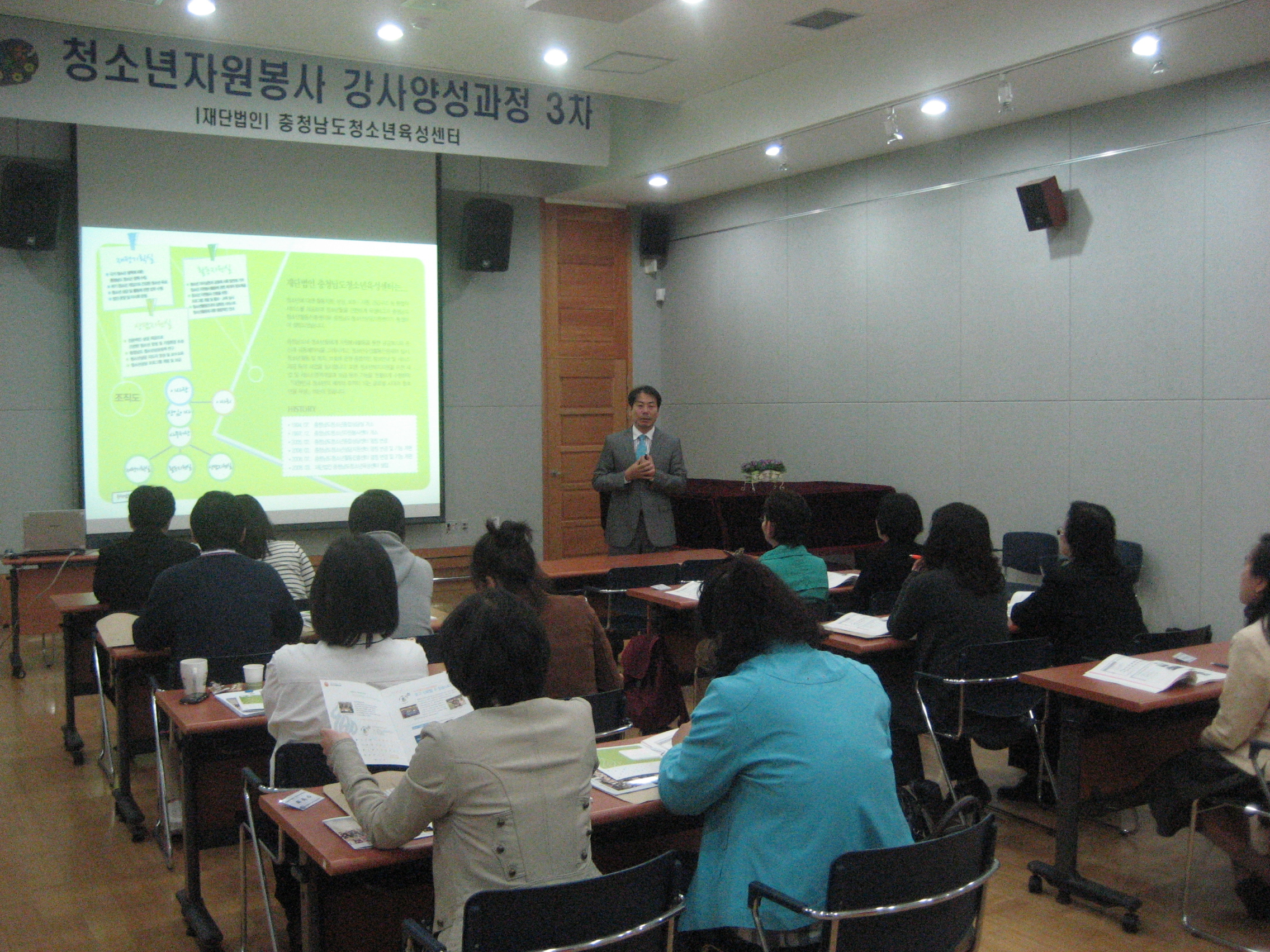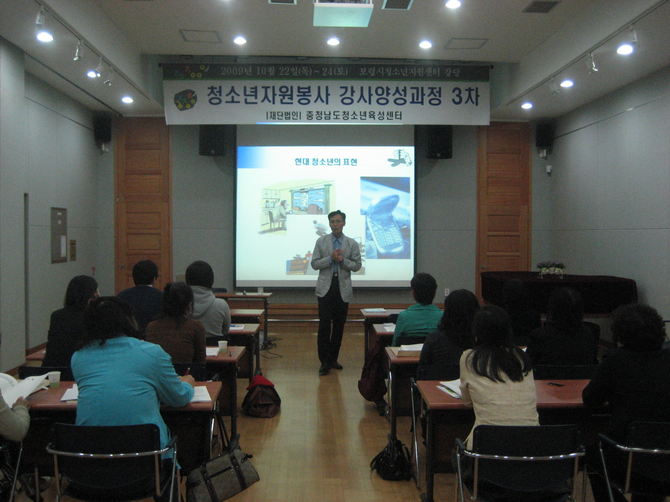 청소년자원봉사 강사양성과정3차 진행 4315 | 최고관리자 | 2009-10-26 충청남도청소년육성센터에서는 보령시청소년지원센터 실무자 및 전문자원지도자들을 대상으로 2009년 10월 22일(목) ~ 24일(금), 3일동안 보령시청소년지원센터 3층 강당에서 진행하였습니다.청소년자원봉사 이론 및 봉사학습이해, 교육매체활용, 교육지도방법, 강의기술법, 강의안작성법소양교육시연등 15시간 양성과정으로 14명의 참가자 중 13명의 선생님들이 수료하였습니다.