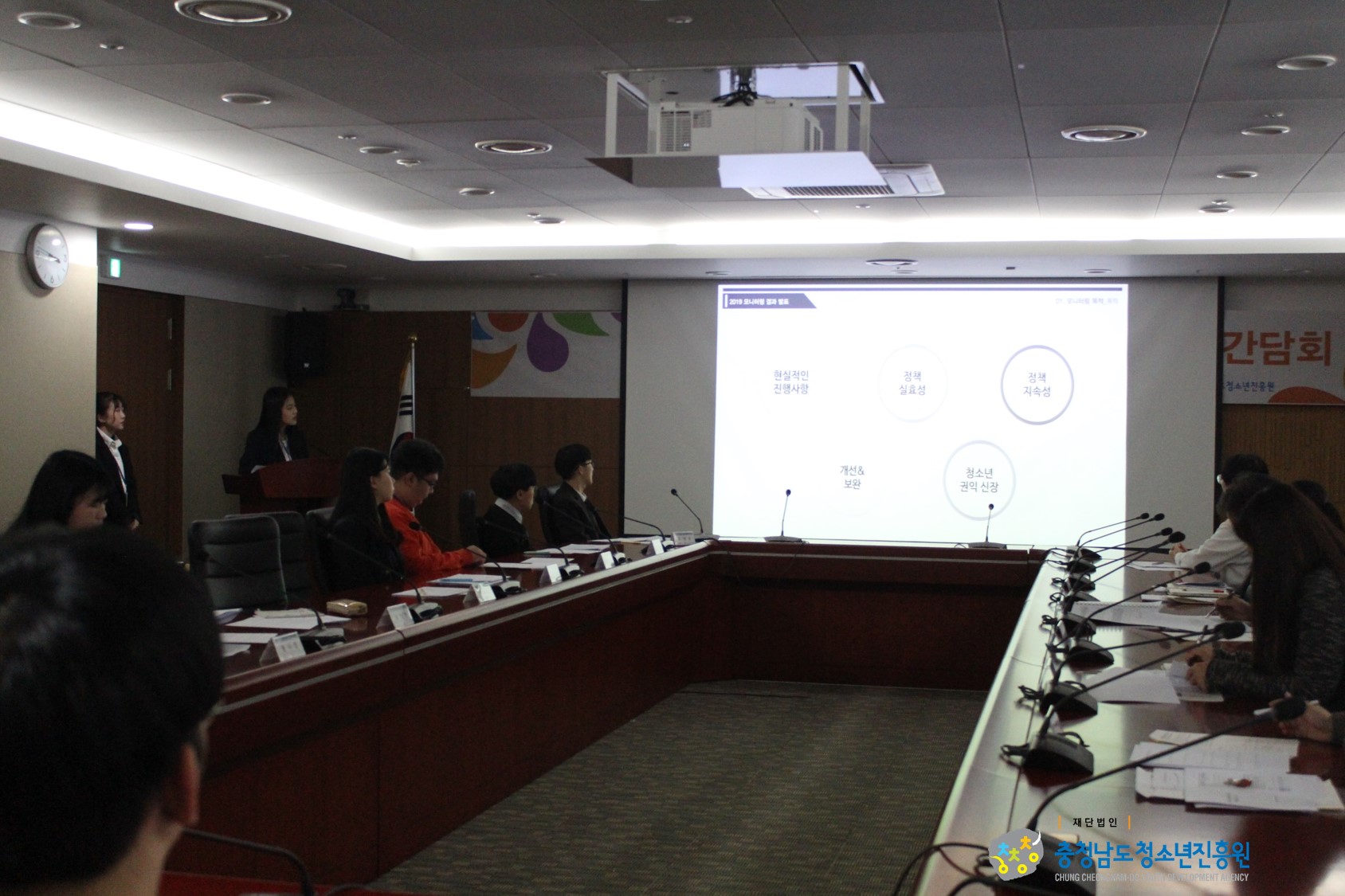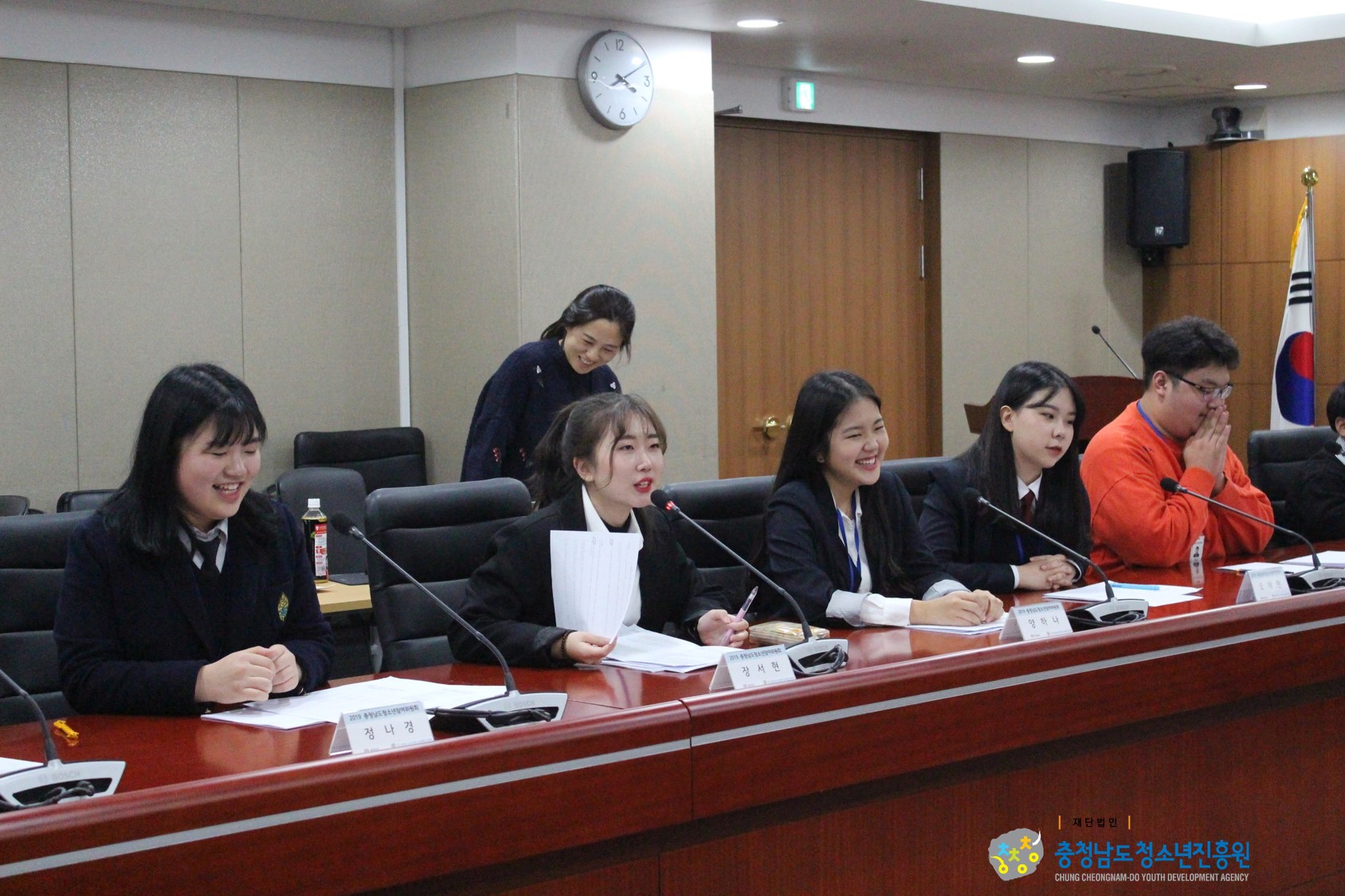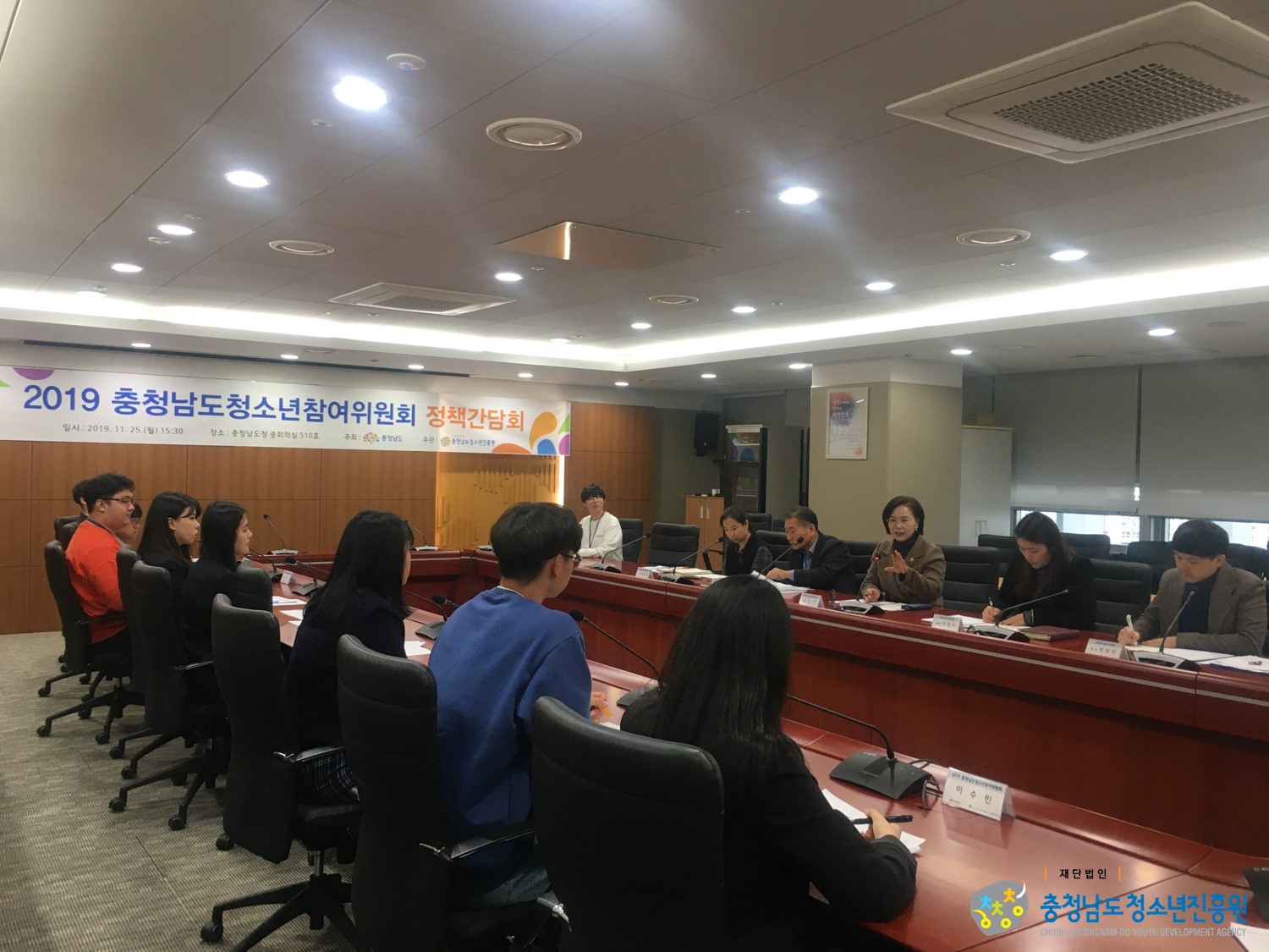 191125 충청남도청소년참여위원회 정책간담회 2452 | 최고관리자 | 2019-11-25 [충청남도청소년참여위원회 정책간담회] 일시: 2019. 11. 25.(월) 15:30 장소: 충청남도청 중회의실