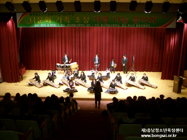2010 세계청소년자원봉사주간 행사 4349 | 최고관리자 | 2010-05-10 (재)충청남도청소년육성센터 활동지원실에서는 매년 세계청소년자원봉사주간을 기념으로 행사를 실시하고 있습니다. 2010년도에 지원사업으로 진행하였으며, '충청남도남부평생학습관', '예산중학교', '서일고등학교', '충남예술고등학교' 4개기관이 선정되어 다문화 봉사활동을 주제로 4.12(월)~4.25(일) 2주간 행사를 진행하였습니다.
