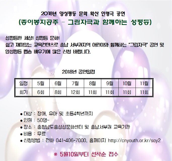 인형극에 참가를 희망하는 기관이나 단체는 5월 10일부터 충청남도홍성청소년성문화센터(041-406-7000) 홈페이지(http://cnyouth1388.cafe24.com/say2/index.html)에서 신청접수를 할 수 있다.