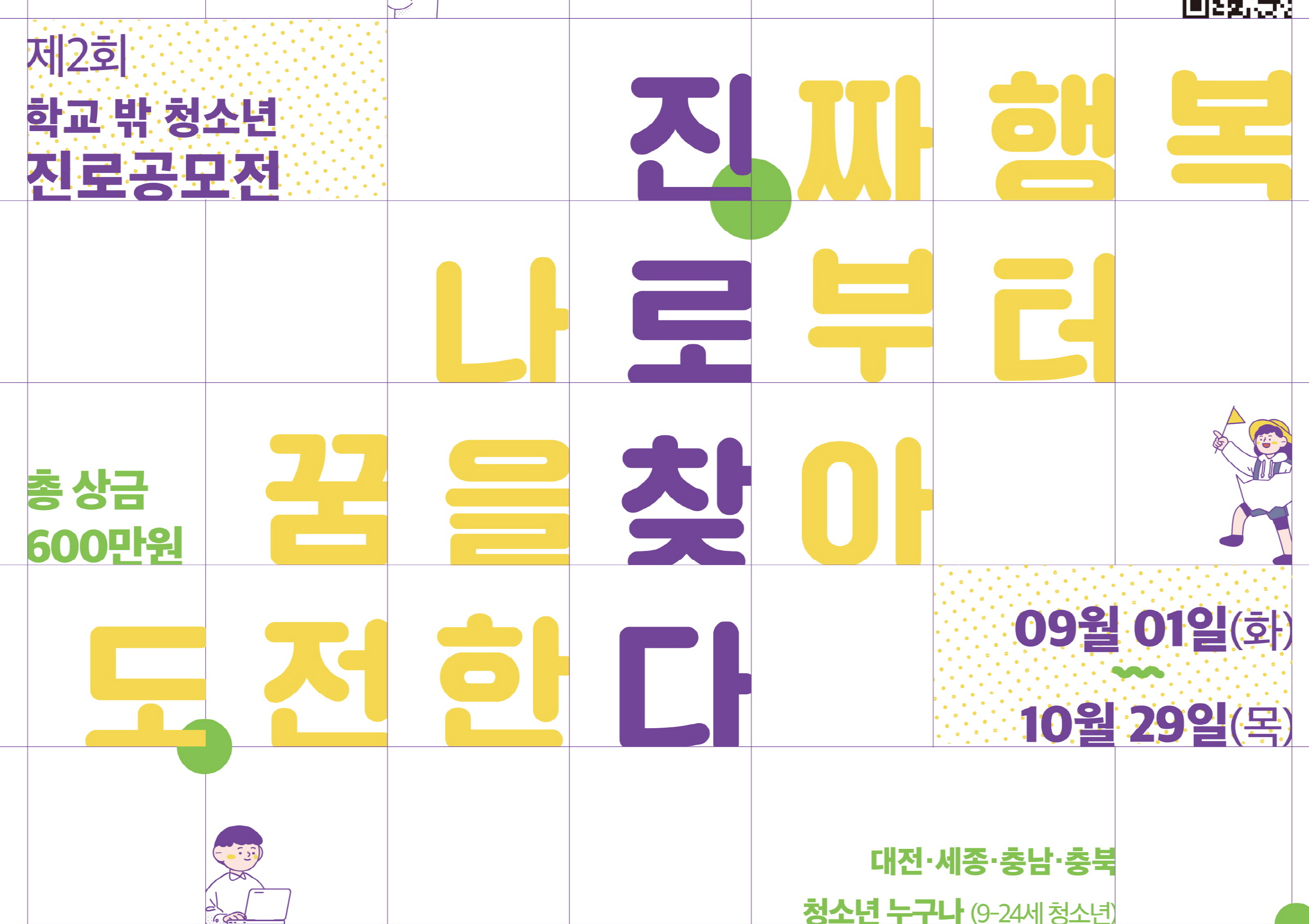 학교 밖 청소년들의 더욱 행복한 내일과 건강한 진로역량계발을 바라는 마음을 담아서 “진·로·찾·다”(진짜행복/나로부터/꿈을찾아/도전한다)라는 부제로 진행되는 본 공모전은 9월 1일부터 접수를 시작하여 10월 29일 마감되며 충청권역(대전/세종/충남/충북) 청소년(9세~24세)이라면 누구나 참여 가능하다.