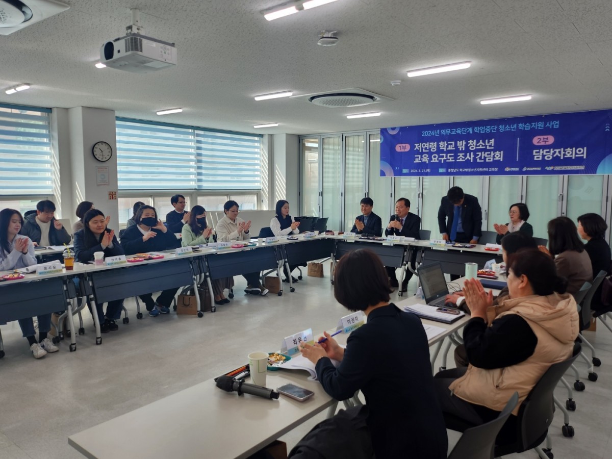 간담회에는 양경모 충청남도의원, 이종규 충청남도 여성가족정책관, 충청남도 내 학교밖청소년지원센터 사업담당자 등 20여 명이 참석하여 저연령 학교 밖 청소년 교육 요구 조사 결과를 듣고 저연령 학교 밖 청소년의 교육지원을 위한 다양한 방안이 도출되었다.