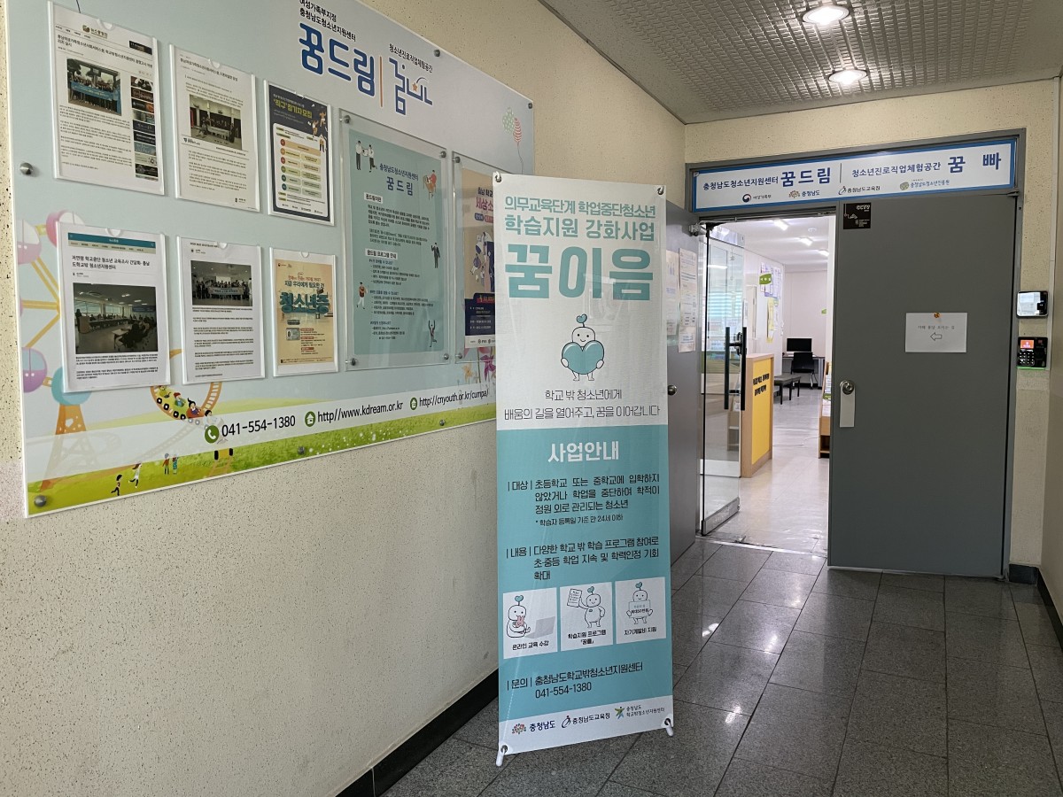 충청남도 내 학교밖청소년지원센터는 2018년부터 의무교육단계에서 학교를 중단한 청소년들의 학력인정을 지원하는 사업을 운영하고 있으며, 올 해에는 총 8개 시·군 학교밖청소년지원센터(천안시, 아산시, 서산시, 계룡시, 당진시, 부여군, 예산군, 태안군)가 참여하고 있다.