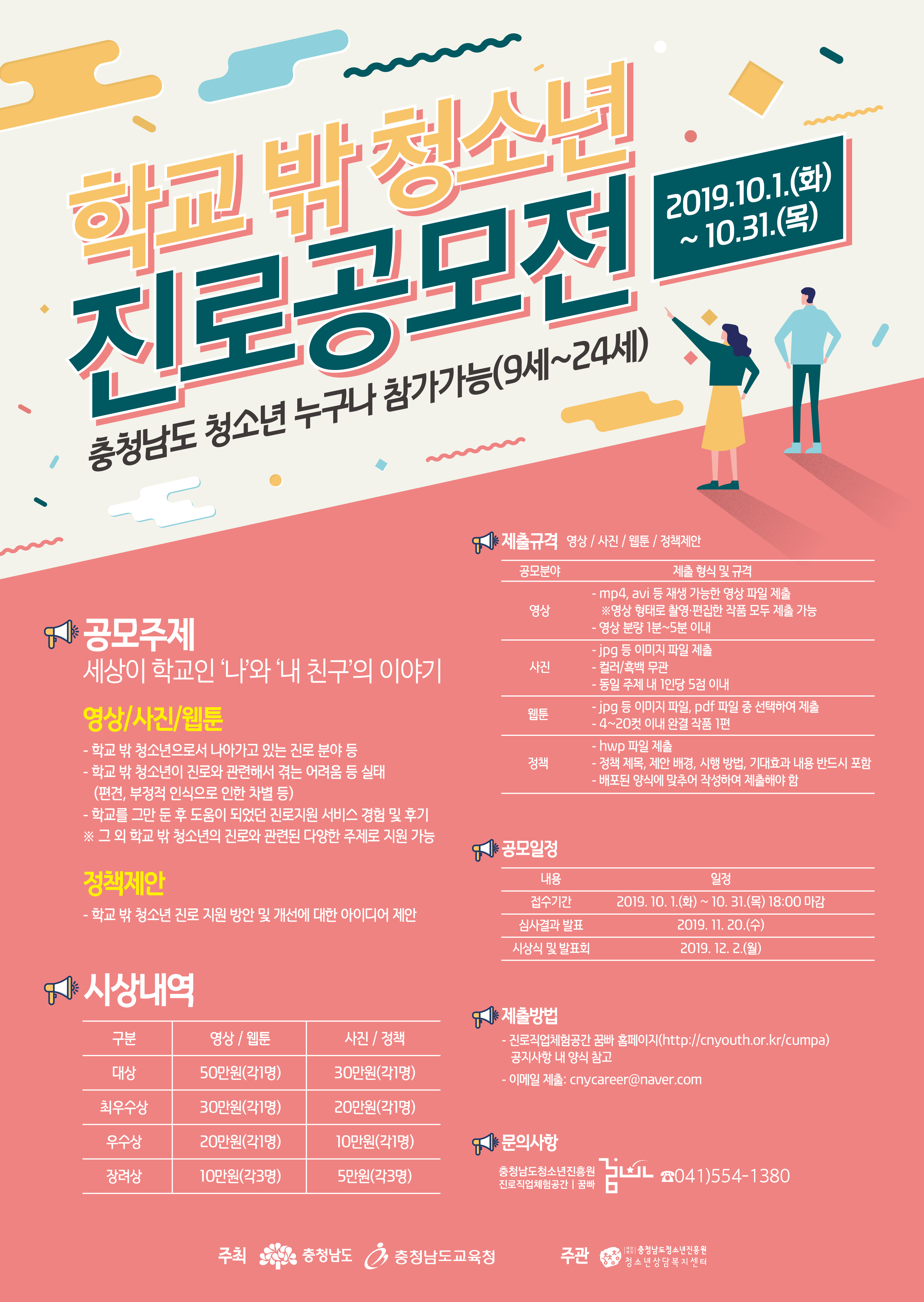 (재)충청남도청소년진흥원(원장 박영의)이 학교 밖 청소년의 진로직업에 대한 지원을 강화하기 위해 '학교 밖 청소년 진로 공모전'을 실시한다고 17일 밝혔다.