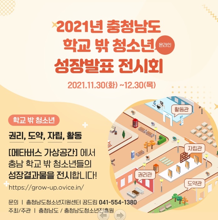[로컬투데이=천안] 주영욱기자/ (재)충청남도청소년진흥원 청소년지원센터 꿈드림은 오는 30일부터 12월 30일까지 메타버스(https://grow-up.ovice.in/)에서 충남지역 학교 밖 청소년들의 성장을 발표와 온라인 성장발표전시회를 개최한다.