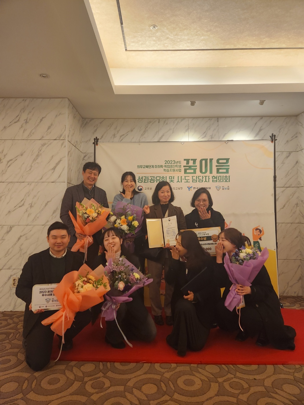교육부와 16개 시·도교육청이 주최하고 한국교육개발원이 주관하는 2023년 「꿈이음 성과공유회 및 공모전 시상식」에서 충남여성가족청소년사회서비스원 학교밖청소년지원센터가 프로그램 우수사례 부문 최우수상(부총리 겸 교육부장관상)을 수상하였습니다. 최우수상을 받은 '꿈틀'프로그램은 학습 플래너를 개발, 보급하여 자기주도 학습을 유도하고, 독서챌린지 활동을 통해 청소년의 문해력을 향상시켰다는 좋은 평가를 받았습니다.