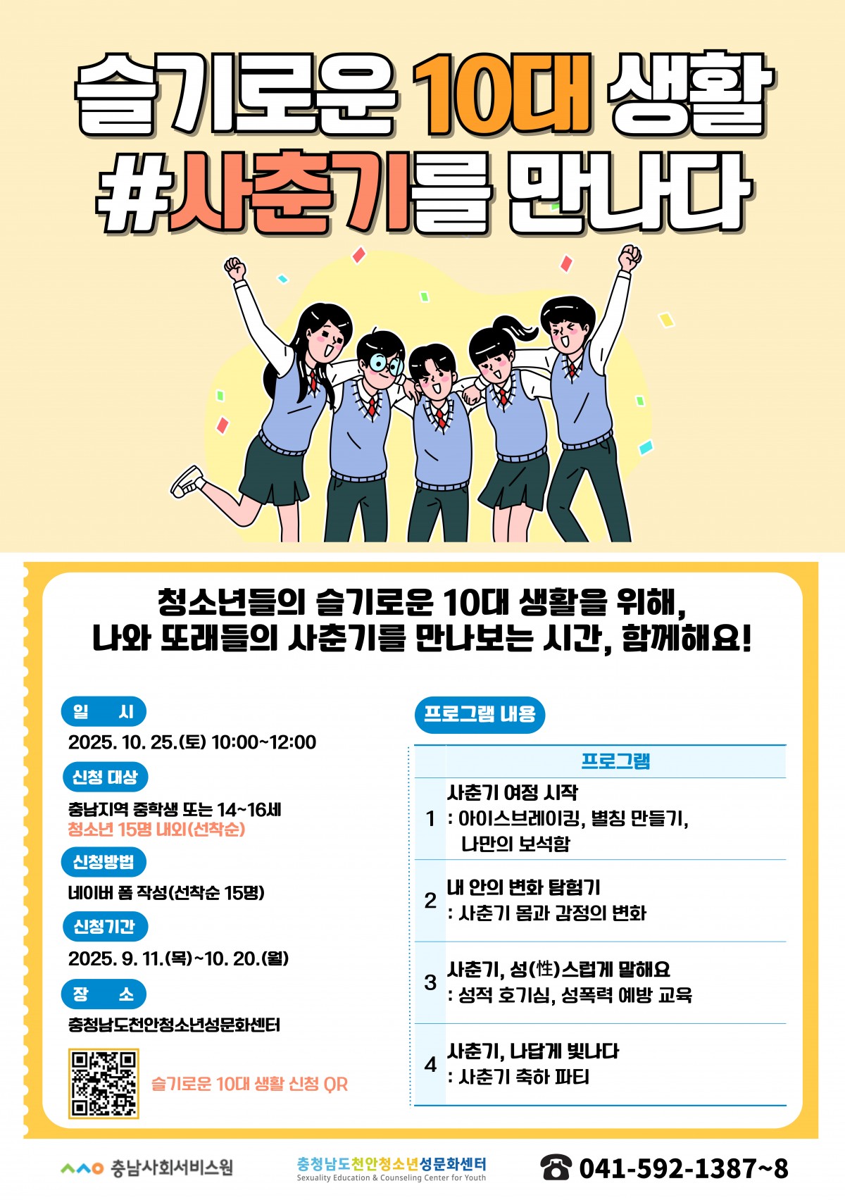 - 대상: 충남 지역 14~16세 청소년 또는 중학생 (15명 내외 / 선착순 모집)