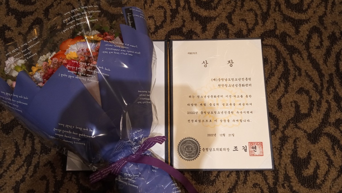 충남청소년성문화센터 '정책성과 보고대회-충남도의회의장상 수상!! 1699 | 천안성문화센터 | 2022-12-21 충남청소년진흥원 '정책성과 보고대회'에서 천안 성문화센터가 충남도의회 의장-(우수시책) 상을 받았습니다.올 한해 부족한 인원으로 모두 고생한 임직원들에게 뜻깊고 보람된 상이 되었습니다.감사합니다.수고하고 애쓴 모두에게 올 한해 감사의 인사를 드립니다.송구영신 하십시요!!