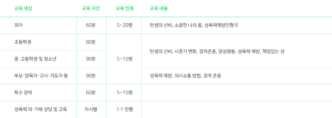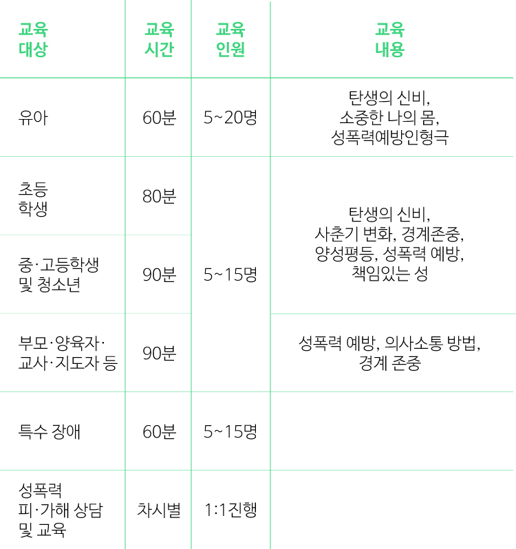 대상별 발달단계에 맞는 성교육·문화 활동을 진행합니다.