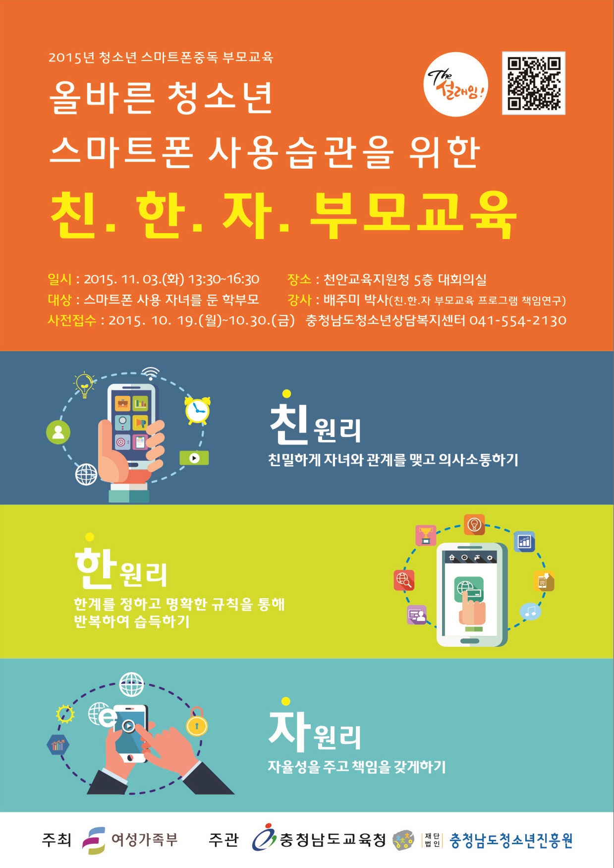 올바른 청소년 스마트폰 사용습관을 위한 부모교육 3618 | 최고관리자 | 2015-10-13 올바른 청소년 스마트폰 사용습관을 위한 부모교육이 이제 곧 접수를 시작합니다. 스마트폰 사용 자녀를 둔 학부모님의 관심과 참여를 부탁드리며, 주변에 많은 홍보를 부탁드립니다.