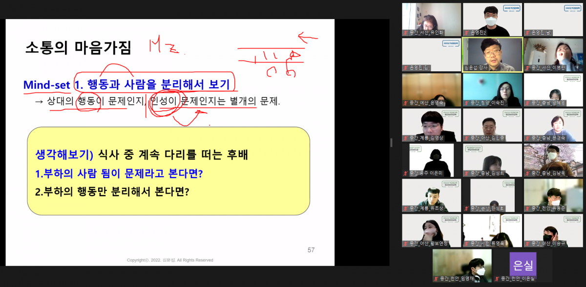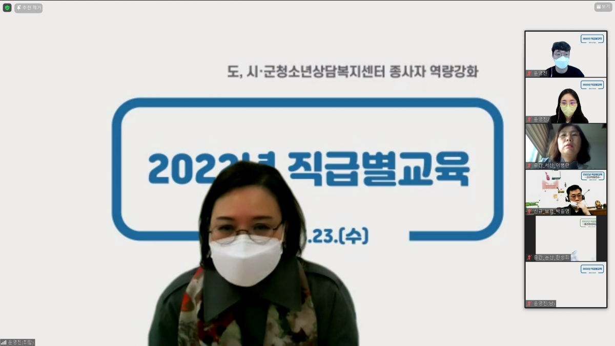 도, 시·군청소년상담복지센터 종사자 역량강화 직급별 교육 1574 | 상담홍보담당자 | 2022-05-06 3월 23일(수)부터 24일(목)까지 도내 청소년상담복지센터 및 학교밖청소년지원센터 종사자(신규직원, 중간관리자, 기관장)를 대상으로 2022년 직급별 교육이 진행되었습니다.직급별 교육은 각 대상별 직무역량을 향상시킬 수 있는 교육으로 구성되었습니다. 교육을 통해 각자의 자리에서 한걸음 더 나아갈 수 있기를 바랍니다! - 신규직원연수: 직장예절, 직무관련교육, 행정실무교육 등- 중간관리자교육: MZ세대 이해 및 팀장 리더십- 기관장워크숍: MZ세대 이해 및 소통 리더십, 조직관리 심화교육, 소진예방 프로그램(영화치료)