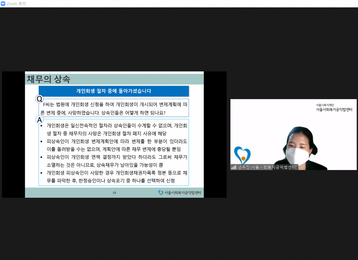 아동‧청소년 빚 대물림 방지 지원 사업설명회 및 상담자 교육 971 | 상담홍보담당자 | 2022-05-06 빚도 대물림 되는 것을 아시나요? 부모의 사망에 따른 상속으로 빚을 물려받을 위기 상황에 처한 충남에 거주하는 만24세 이하 아동‧청소년 대상으로 법률지원서비스를 시작합니다. 도내 지자체 및 청소년유관기관 실무자들을 모시고 충청남도 아동‧청소년 부모 빚 대물림 방지 지원사업 사업설명회와 상담자교육을 실시하였습니다. 법률지원서비스에 대한 사업소개와 상속관련 법률교육으로 기본적인 상담을 진행할 수 있도록 내용을 구성하였습니다.