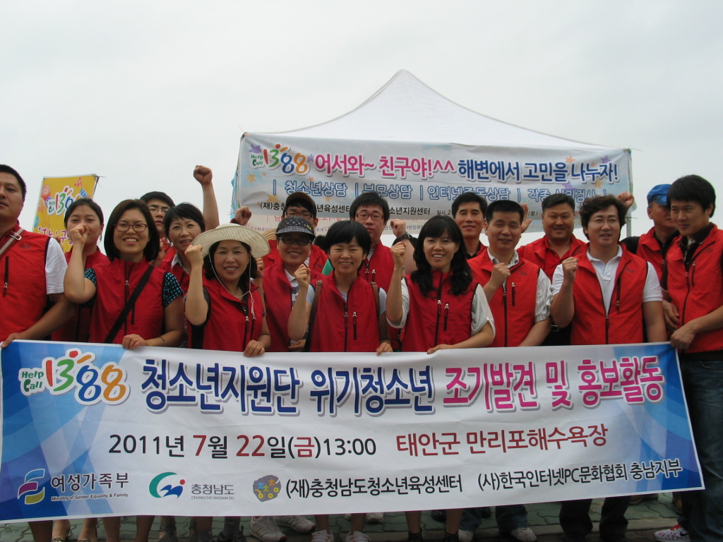 1388청소년지원단과 함께 가출청소년을 위한 해변아웃리치 활동 3390 | 최고관리자 | 2011-07-25 장소 : 태안구 만리포해수욕장일시 : 2011년 7월22일(금)-23일(토)연계기관 : 태안군청소년지원센터, 1388청소년지원단 (사)한국인터넷pc문화협의회 충남지부