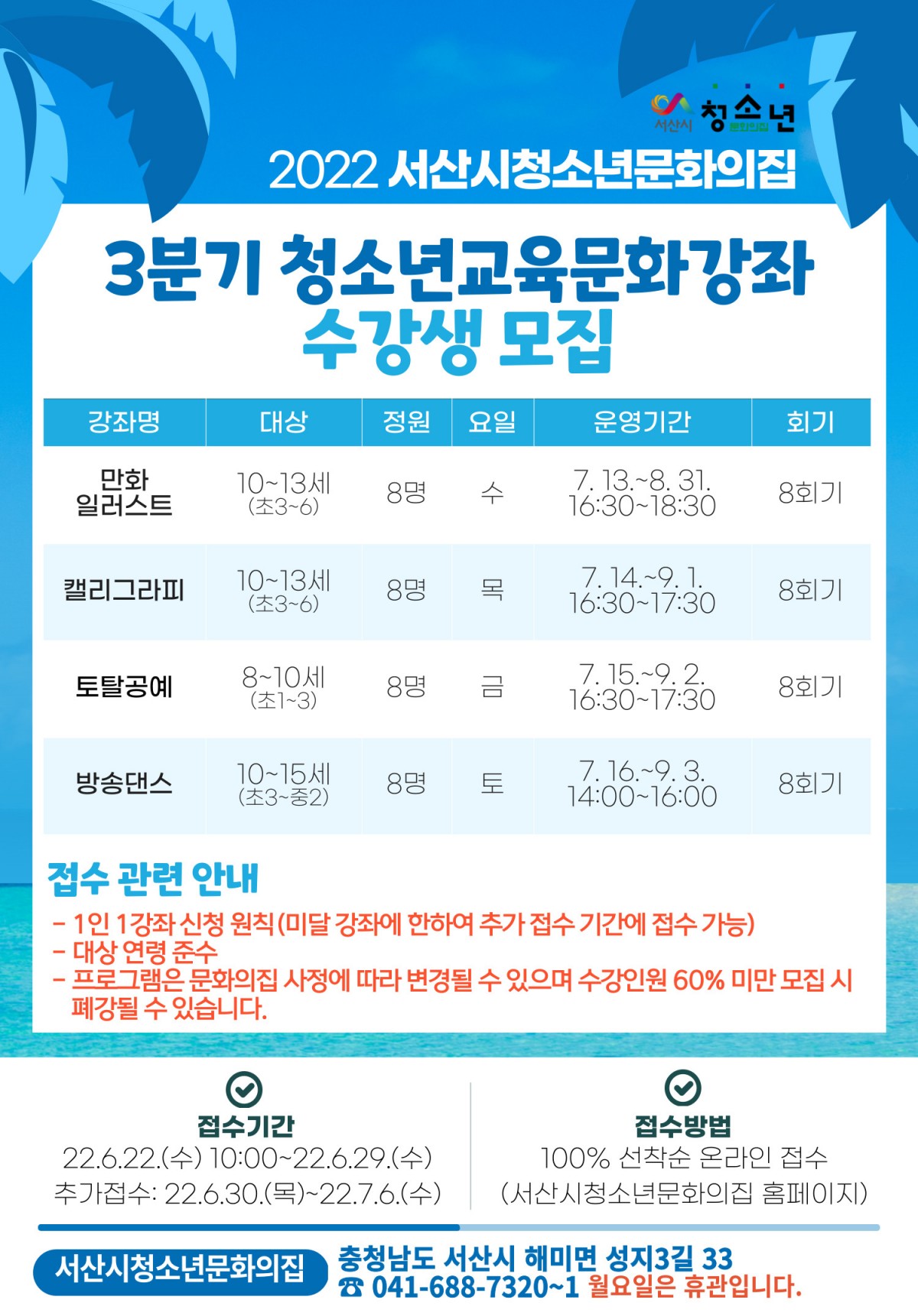 [서산시청소년문화의집] 3분기 청소년교육문화강좌 수강생모집 1545 | 활동진흥센터 | 2022-06-22 https://www.youth.go.kr/youth/act/actSearch/actSearchDtl.yt?sCrtfcText… + 1106 활동개요- 기간: 2022. 7. 13.(수)~2022. 8. 31.(수)활동목표 및 상세내용- 내용: 쉽고 재미있게 배우는 캐릭터 표현법- 만화 일러스트, 캘리그라피, 토탈공예, 방송댄스