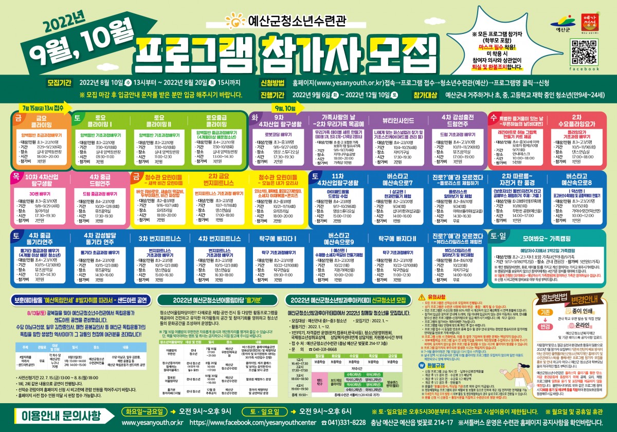 [예산군청소년수련관] 2022년 9월, 10월 프로그램 참가자 모집